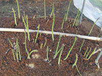 収穫の準備もほぼ終わり、暖かい日は気温も15℃くらいまで上がるようになりました。 3月も寒い日が続き、なかなか顔を出してくれなかったアスパラですが、やっと元気に顔を出してくれました。 少しずつ収穫も始まっています。 |